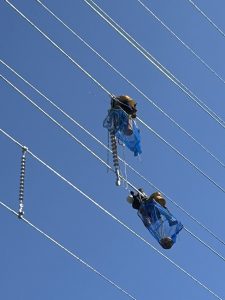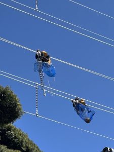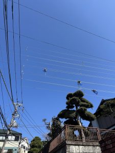 清々しい空気の中 きれいな青空を見上げビックリしました。このようなお仕事されている人たちのおかげで、快適な毎日を送れていることに、とても感謝できる光景でした。50年目の電線取り換え工事だそうです。
